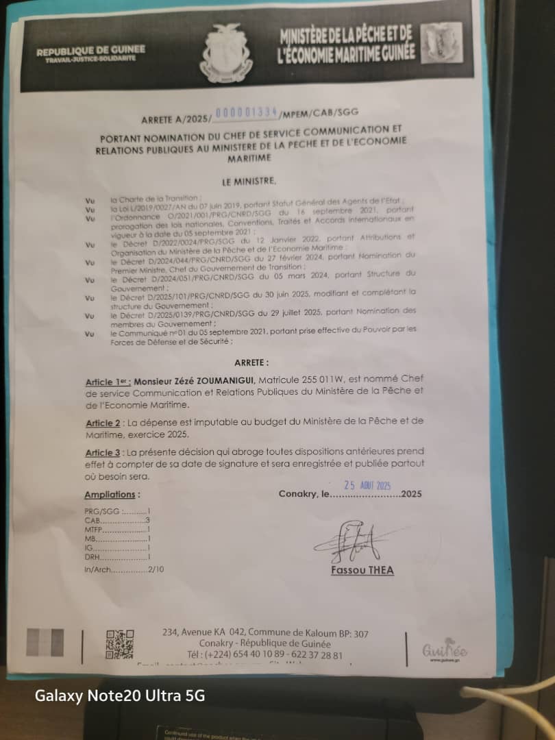Une nomination stratégique pour le Ministère de la Pêche et de l’Économie maritime qui a un nouveau responsable pour sa communication. Par un arrêté signé le 25 août 2025, le ministre Fassou Théa a désigné Zézé Zoumanigui pour diriger le Service de la Communication et des Relations Publiques.